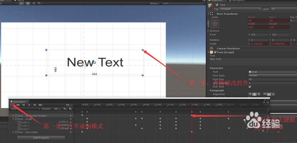 按下录制按钮,在上面的时间条上单击,移动红线,然后在左边层级面板选中Text,然后直接在Scene面板中修改Text的尺寸/位置,我们看到对应属性自动被添加到列表并被打上关键帧。