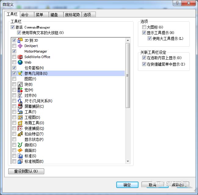 4、进入自定义的对话框,上面一排第一个就是工具栏的选项,在下面的列表中排列着一些选项,你可以勾选“2D到3D”,“motionmanager”“参考几何体”等选项并单击【确定】按钮,此时这些工具栏的选项都会显示出来啦!