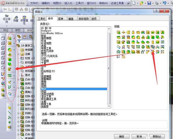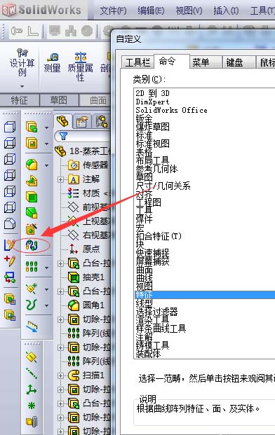 7、选择“命令”选项卡“类别”列表框中的“特征”项,单击按钮框中的“曲线驱动阵列”,并将其拖到“特征”工具栏,完成添加按钮的操作。