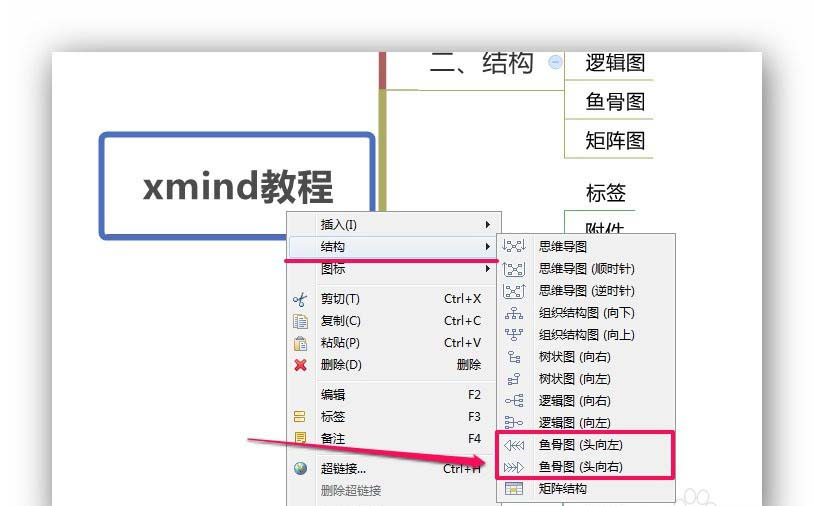 选中主题,右键点击,选择[结构]→鱼骨图。