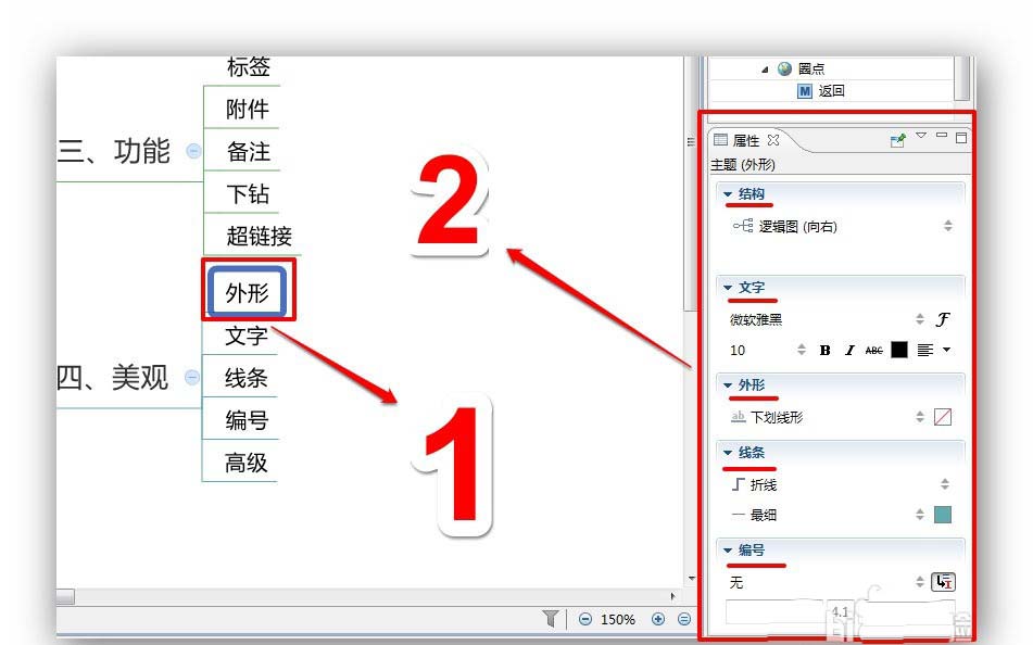 选中主题,会出现主题的【属性窗口】,在该窗口,可以调整这写内容,美观我们的思维导图。
