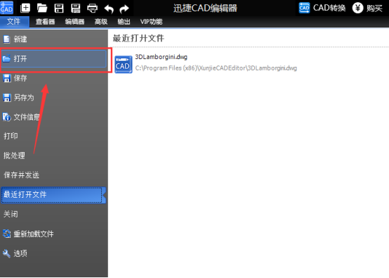 1、打开迅捷CAD编辑器,然后点击界面当中的“文件”选项,并且点击“打开”选项, 将需要编辑的CAD文件打开。
