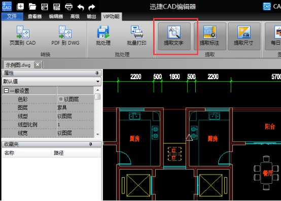 2、打开CAD文件以后,需要点击界面当中的“VIP功能”选项,然后在点击里面的“提取文字”,会打开提取的文字窗口。