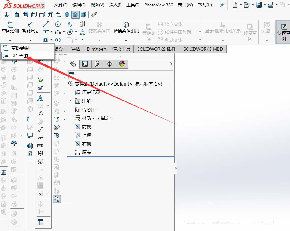 2、如下图所示,点击“草图绘制”旁的三角弹出下拉菜单,点击“3d草图”同时单击任意一基准面以进入草绘工作区域。