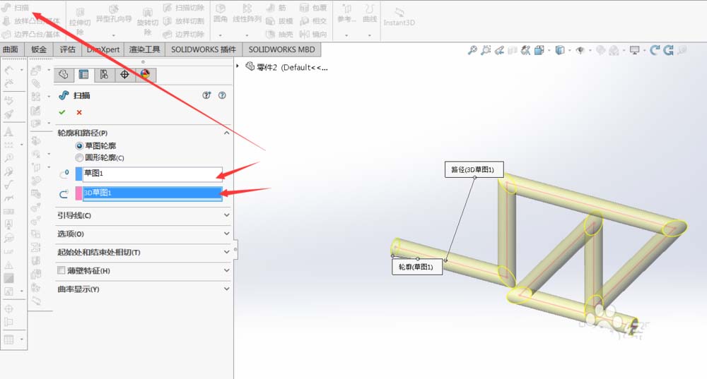 6、单击“扫描”,并依次选中草图圆和草图直线。单击完成,3d空间模型即可完成。