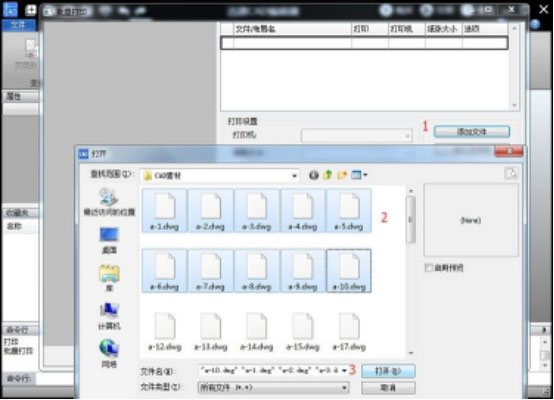 3、在批量打印对话框中,点击“添加文件”,在弹出的对话框中,按照路径选择要打印的CAD图纸,选中文件后,点击“打开”按钮,将要打印的CAD图纸添加到软件的批量打印列表中。