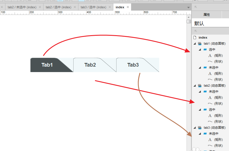 6、复制三个“tab1”元件,并分别改变文字为:tab1/tab2/tab3,并命名,且将tab2/tab3的选中状态置后: