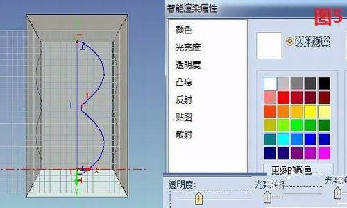 第三,现在我们来做中间沙漏的部分,我们在沙漏的中间部分画出如图所示的图形进行旋转成型。并且用智能渲染将图形渲染成白色并将透明度调到比较高的模式。并将光亮度调高。