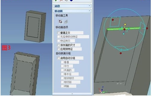 第一,在实体设计右侧的设计元素库中拖拽入长方体编辑包围盒的尺寸为200、120、70。再从右侧的设计元素库中拖入孔内长方体放到长方体表面的中心修改尺寸为140、85、4。选中如图2所示的面,并按键盘F10或者鼠标左键点击三维球图标的快捷键,空格键三维球与面脱离关联并用点定位的方式移动到靠里边的边的中点,再拾取三维球的定向操作柄指向大的长方体的边的中点。最后四个面分别用此操作形成如图1、2、3所示。