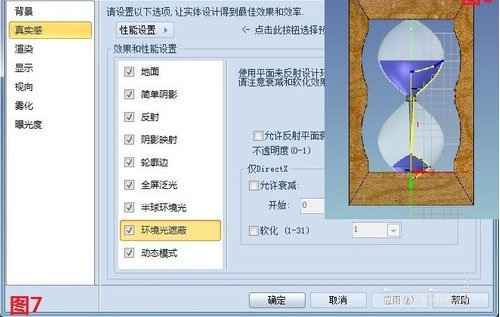 第四,依照第三步的草绘图形旋转来做内部的流沙形状,并渲染成自己喜欢的颜色,小编个人比较钟爱蓝色流沙哦~,再利用贴图里面的木纹贴图将沙漏的外观颜色修改下并右键单击设计环境选择真实感渲染里面全部勾选上。就能形成比较逼真的沙漏了。如开篇的图片。