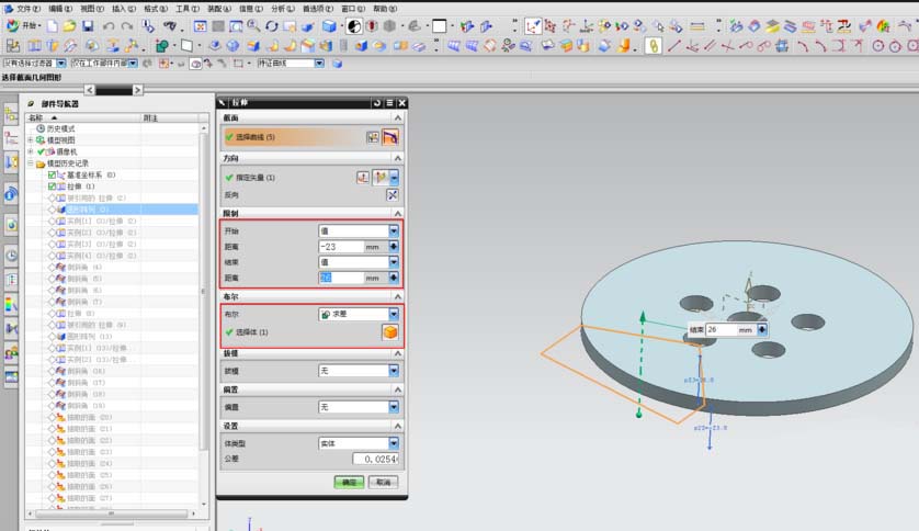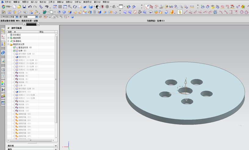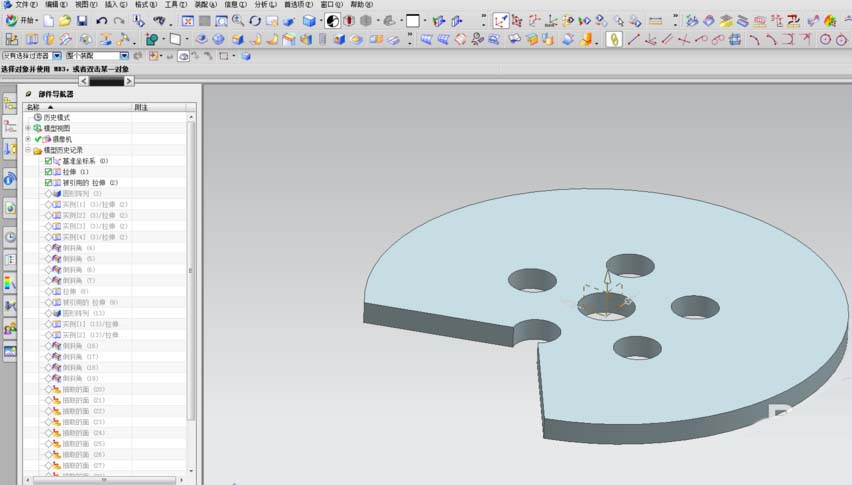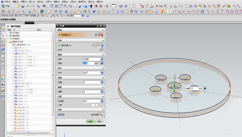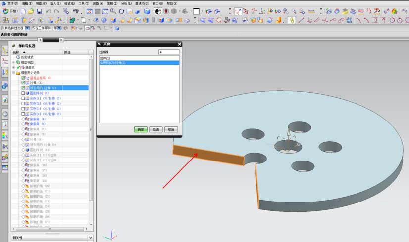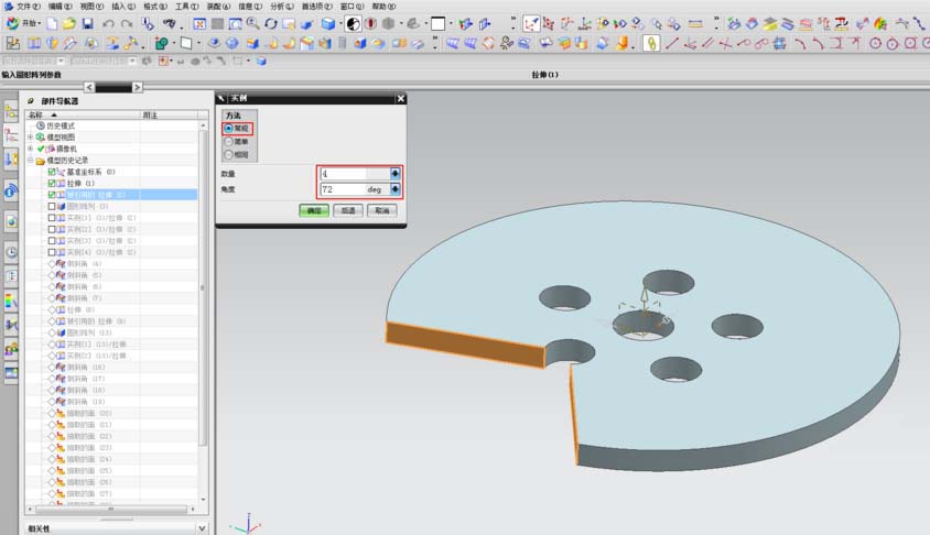 4、单击插入-关联复制-实例特征命令,选择圆形阵列,选中上步拉伸,方法选择常规-输入相关参数值,基准轴选择Z轴,完成实例特征操作。
