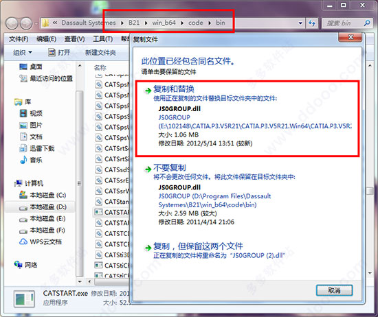 6、安装完成后先不要运行,我们回到安装包,打开“Crack”文件夹,将CATIA V5R21破解补丁“JS0GROUP.dll”复制到安装目录下覆盖源文件即可完成破解。