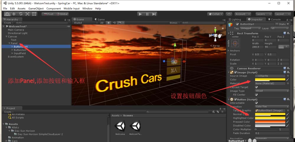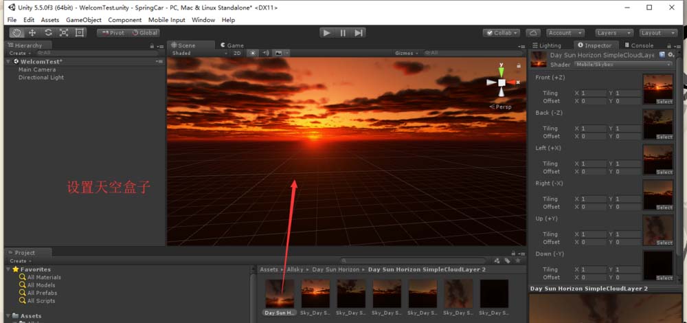 1、首先新建一个Scene. 然后找一个天空盒子,设置到场景。如图,使用夕阳做演示。