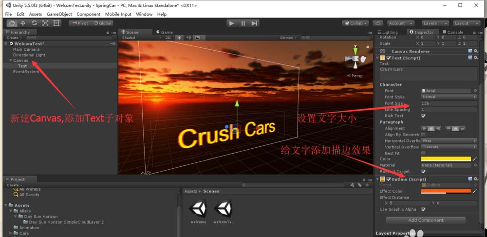 2、新建一个Canvas对象,并新建一个Text子对象。改变Text的颜色,并添加一个Outline特效组件,设置颜色和偏移,产生如图所示描边效果。