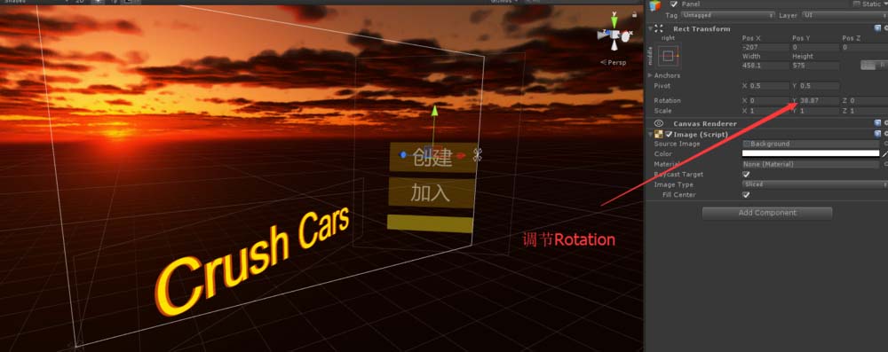5、分别选中Panel和Text组件,改变他们的Rotation Y属性值。在Scene窗口观察,(关闭2D),效果如图。