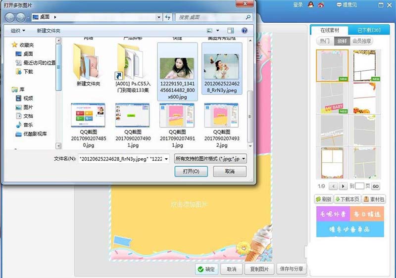 2、点击右侧选择喜欢的海报素材,点击添加多张图片,按住ctrl键先后点击选择两张图片,点击打开。