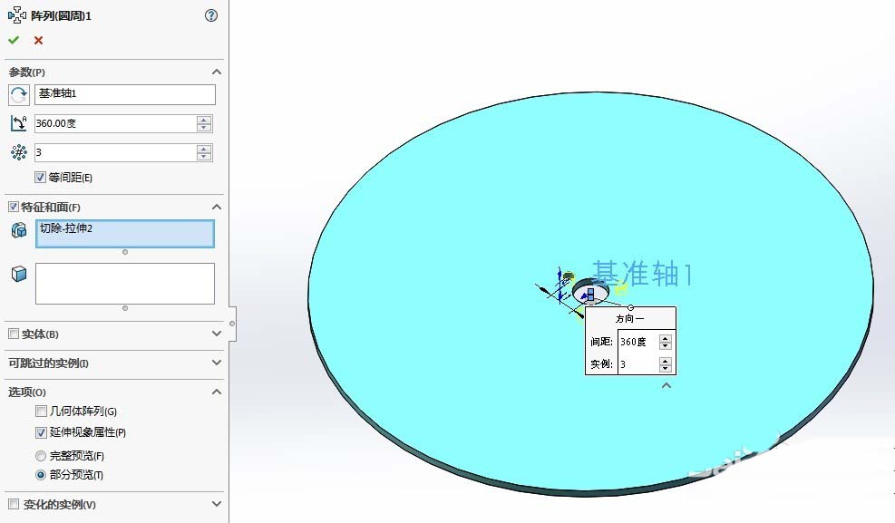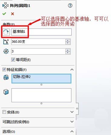 5、方向选项中,如果是规则外边缘图形(圆形)可以选择圆形外边框线,如果遇到不规则圆形,就需要建议一个基准轴,待阵列特征会以基准轴为圆心进行阵列。