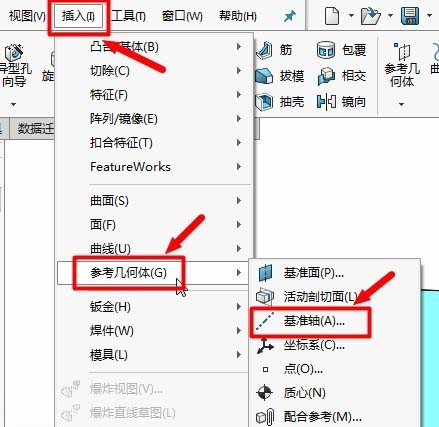 1、点击【插入】菜单栏中的【参考几何体】下的【基准轴】