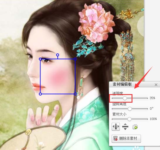 6、点击选择的腮红效果,将其拖拽到人物的面部,并调节透明度参数如图所示: