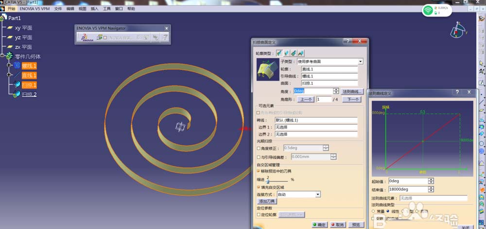 9、以直线1为轮廓,螺线为引导曲线,扫掠1为曲面,再定义法则曲线为线性,角度0-18000