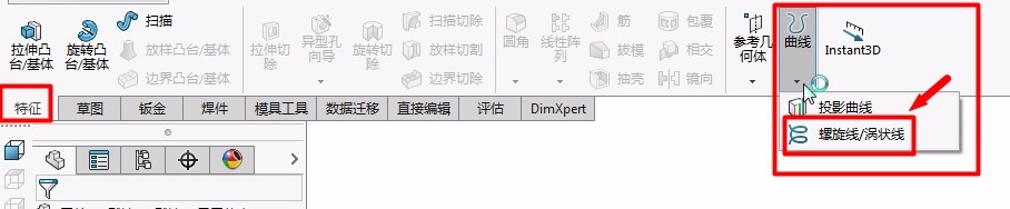 2、点击【特征】工具栏中【曲线】下拉菜单,选择【螺旋线/涡状线】功能。