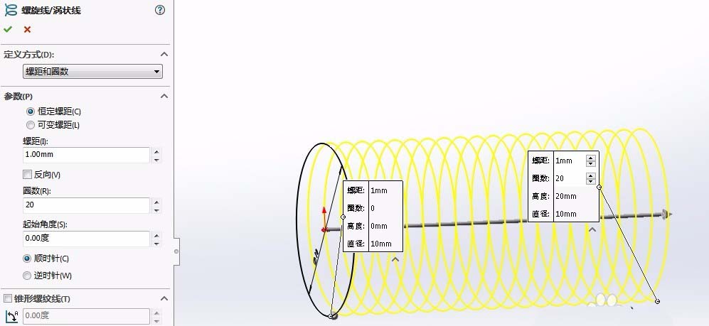 3、在弹出的设置对话框中对弹簧参数进行设置。设置完成后即可在绘图区看到弹簧大体轮廓的预览图。不过此时还只是一根线。