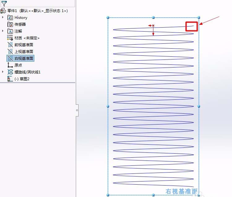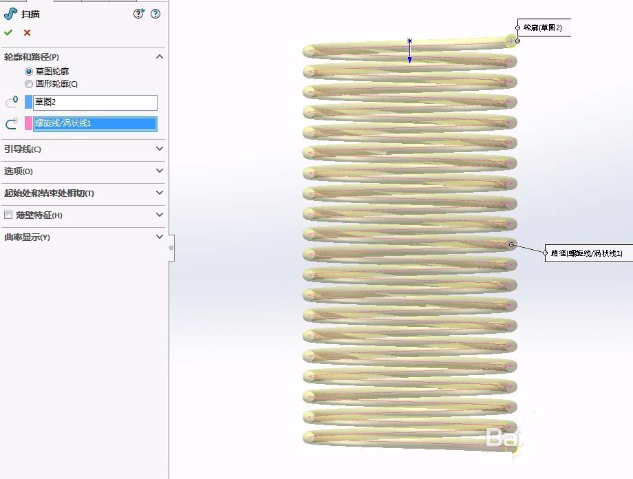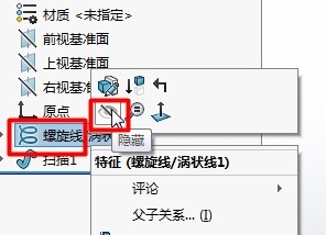 7、此时弹簧内还有一根路径线很不美观,取出的方式是:选中左侧螺纹线/涡状线右击,在功能键中选择【隐藏】功能,路径线就被隐藏了。此时一个完整的弹簧就呈现出来了。