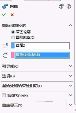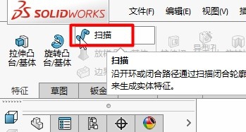5、绘制完成后点击【特征】内的【扫描】功能。在弹出的对话框中进行图纸选择。按照软件提示,第一个选择扫描物体,第二个选择路径。