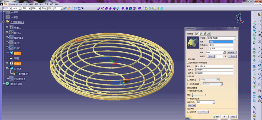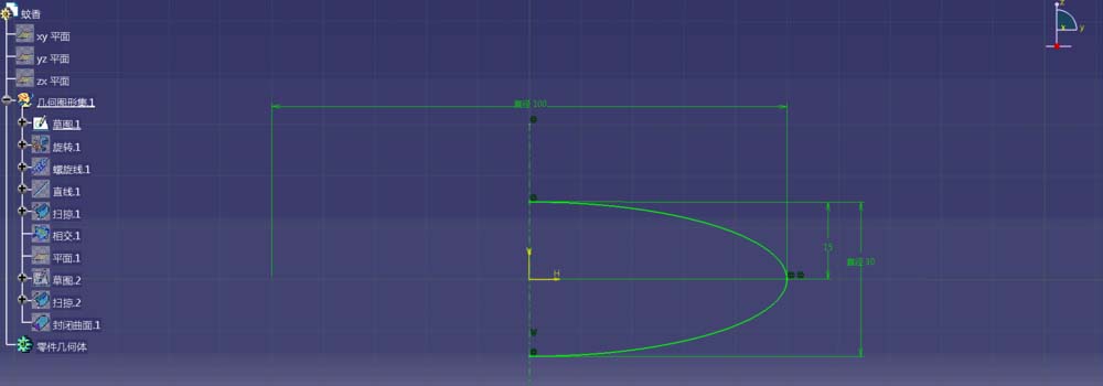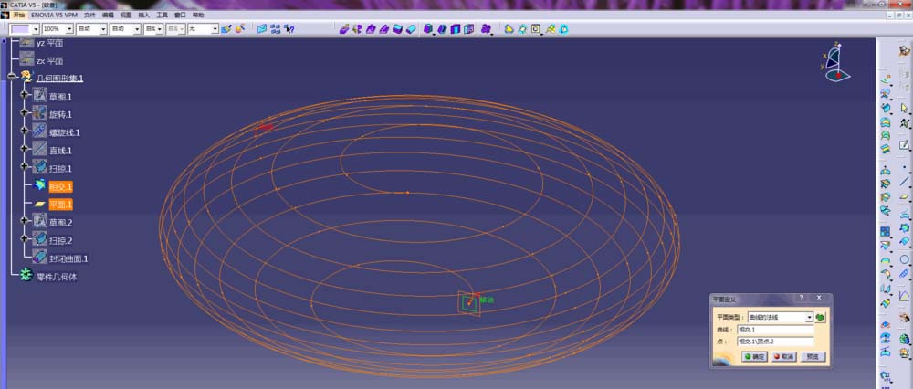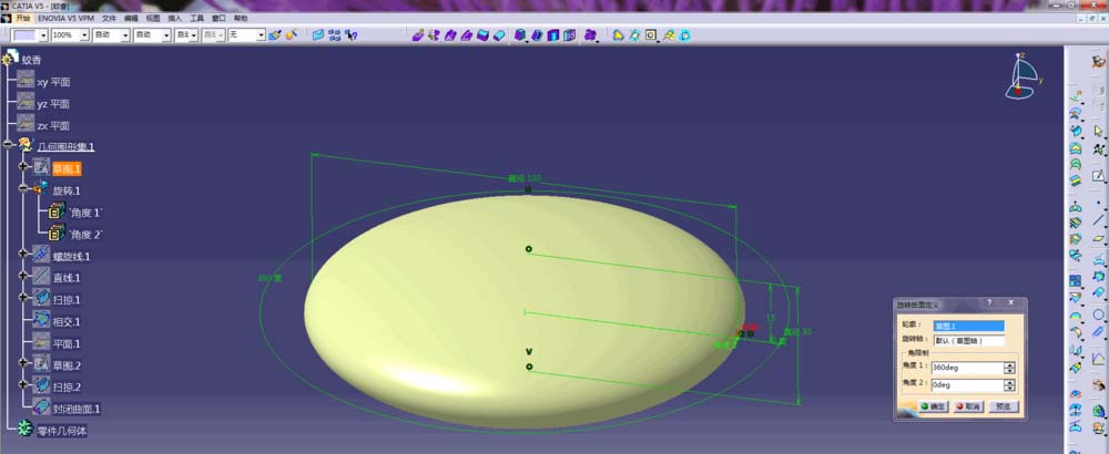 1、打开CATIA,进入创成式曲面设计模块,以yz平面为草图参考面创建一个椭圆形的弧线,并对草图进行旋转命令的操作,生成一个如图所示的曲面;