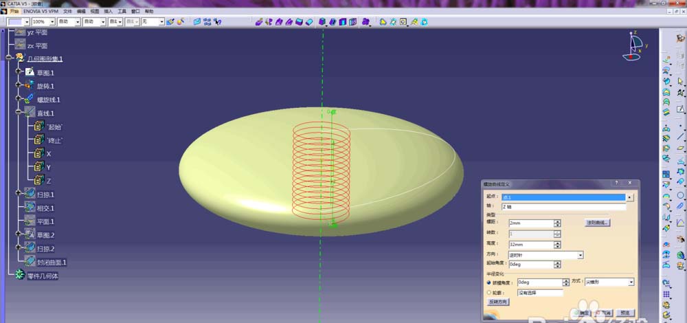 2、通过螺旋线命令生成一条曲线,螺旋线起点坐标为<10,0,-15.5>,轴线选择z轴,螺距为2mm,高度为32mm,其他选择默认,单击确定退出命令对话框;