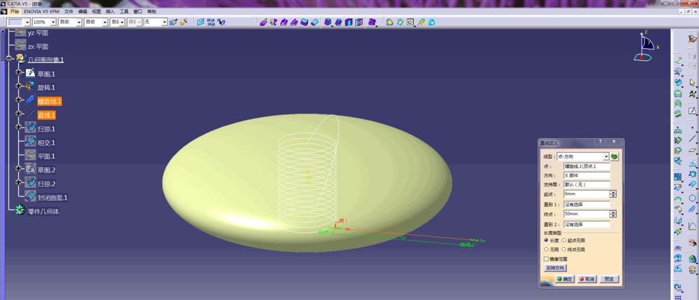3、以螺旋线的起点为端点,生成一条直线,直线长度50mm,方向为x方向;