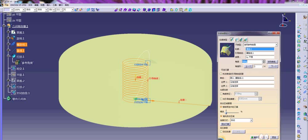 4、通过扫掠命令,以直线.1为轮廓线,引导线为螺旋线.1,参考曲面为xy平面,子类型为使用参考曲面,单击确定并退出命令对话框;