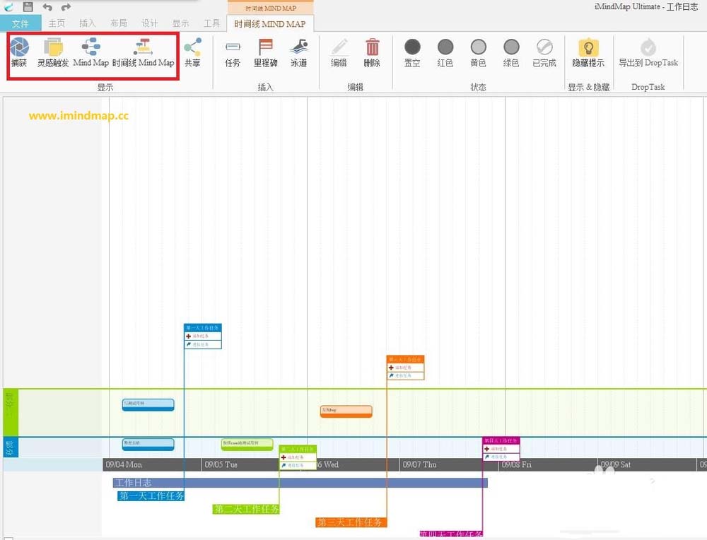 1、如图,时间线MindMap已经完成,可以点击左上角的其它视图图标切换视图,非常简单。