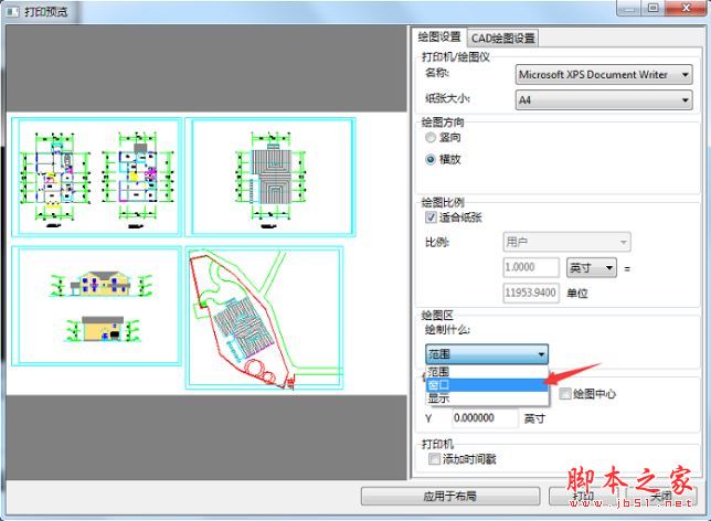 第三步、在打开的“打印预览”窗口的“绘图设置”菜单中,我们可以即可对打印的CAD图进行设置,这里想要打印CAD图中的一部分,可以在绘图区的范围中选择“窗口”。