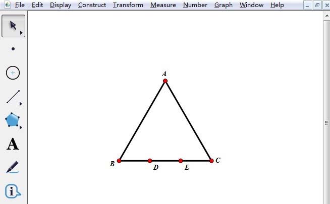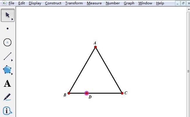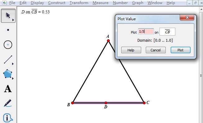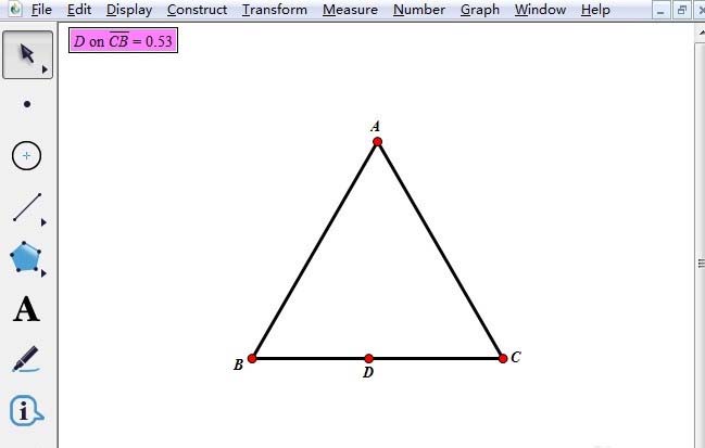 1、画等边三角形ABC,使用“点工具”在边BC上任意画一点D,执行“度量”——“点的值”命令,得到该点在边BC上的值。