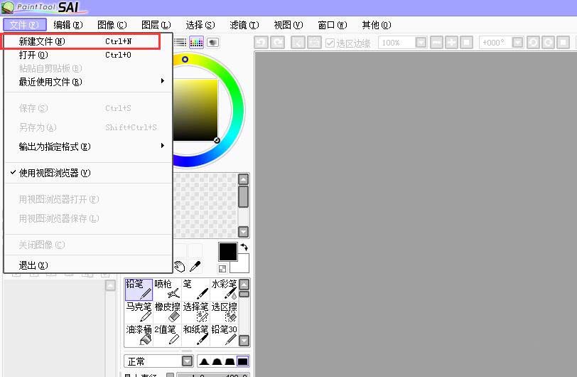 1、打开绘画软件SAI,在菜单栏上点击“文件”——“新建文件”;