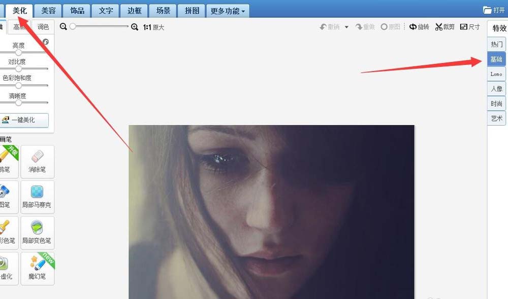 1、首先,打开美图秀秀软件,打开一张需要美化的图片,点击左侧美化 ,接下来在右侧点击特效下面的基础 选项。