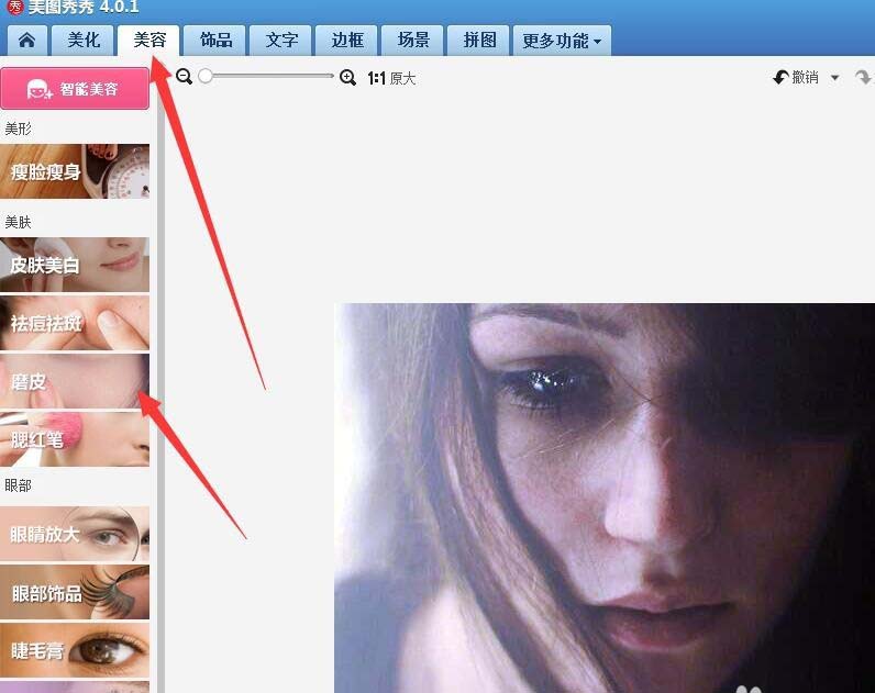 3、接下来,选择美容菜单下面的磨皮功能。