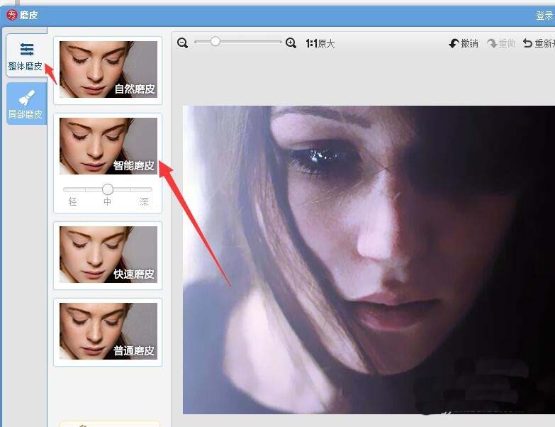 4、选择整体磨皮下面的智能磨皮,还可以选择局部磨皮,然后手动磨皮,之后点击应用。