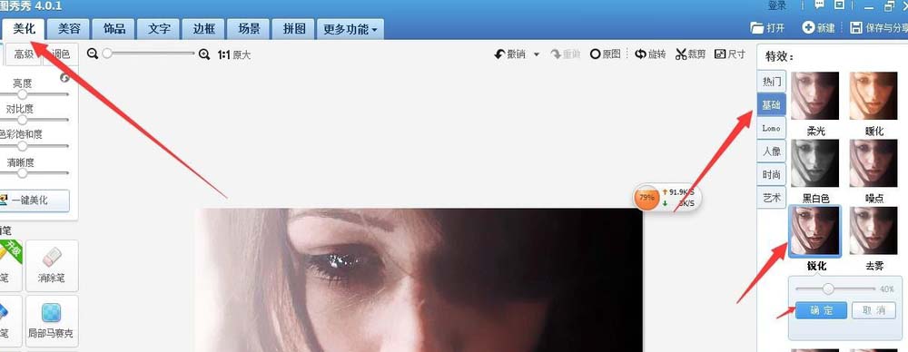 7、接下来,在美化的菜单下面,选择基础的锐化,调整到40%。
