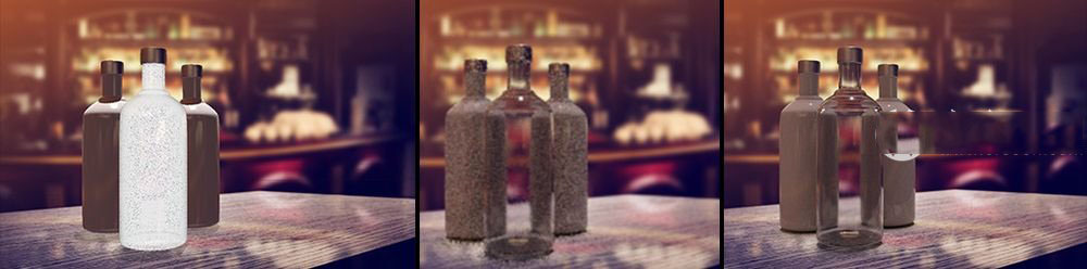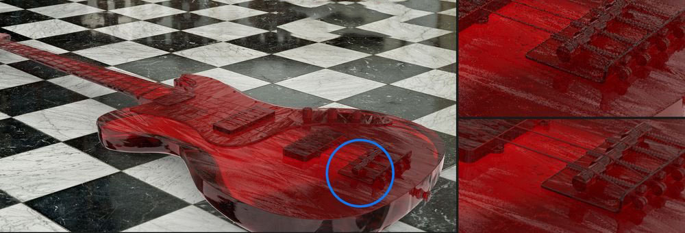 (左)完整的构图渲染。(右上)低品质渲染的区域,缩放300%。(右下)高品质渲染区域,缩放300%。