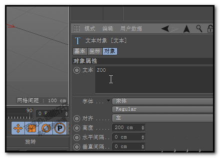 2、场景中现出“文本”两字。我们在文字属性面板这里把“文本”删除,输入我们目标文字;比如,ZOO