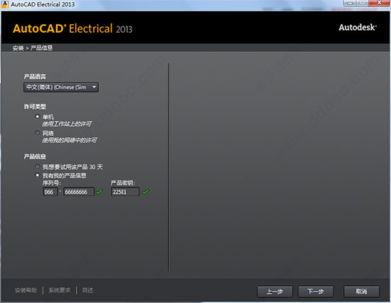 4、输入序列号:066-66666666,产品密钥:225E1,点“下一步”。