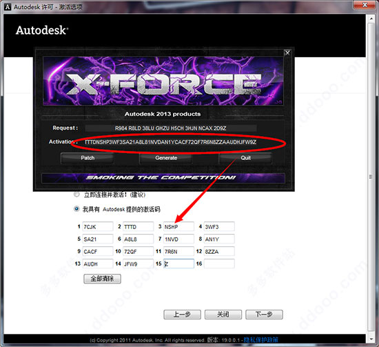 10、选中“我具有autodesk激活码“,把注册机第二栏生成的激活码复制到文本框里(共16框),点击“下一步”。