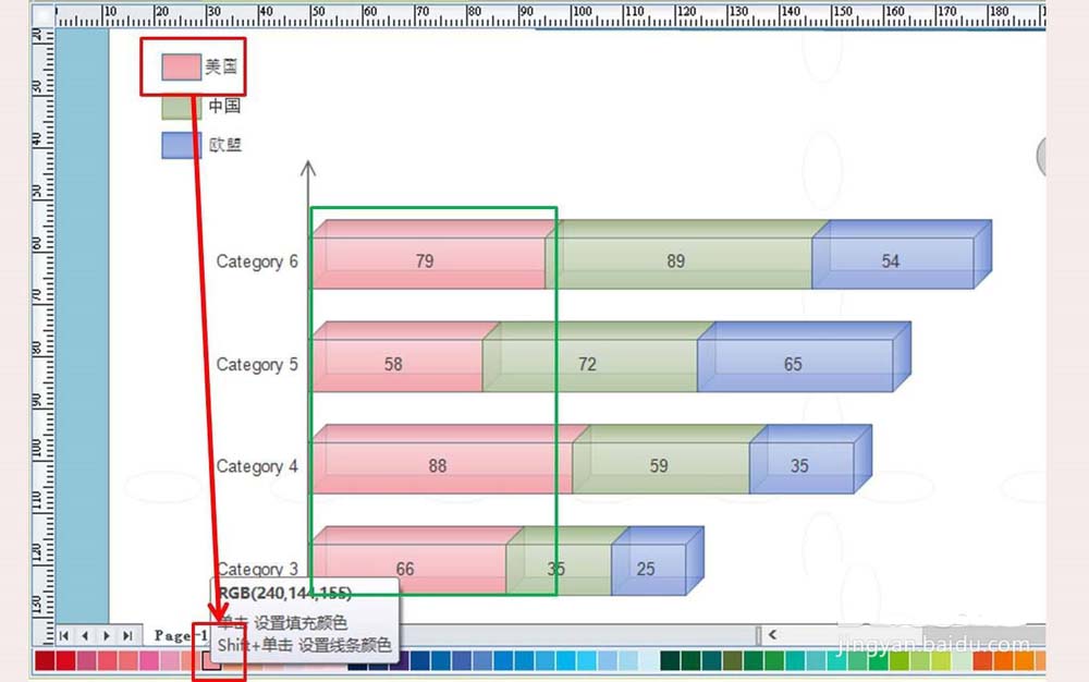 6、图例颜色修改。选中图表中的任意图例,然后在画布的下方点击其中一个颜色色块就能将图例颜色调整为该色块颜色。同时,条形图中的颜色也相应的发生变化。