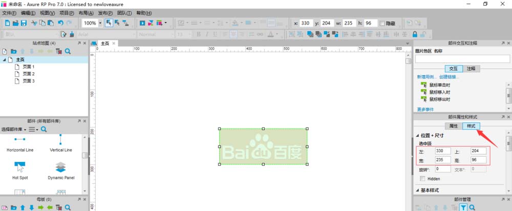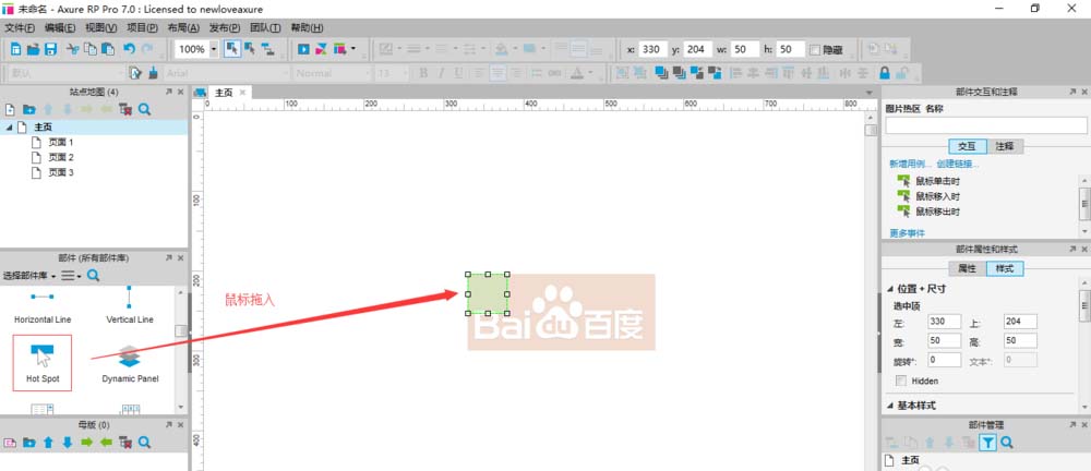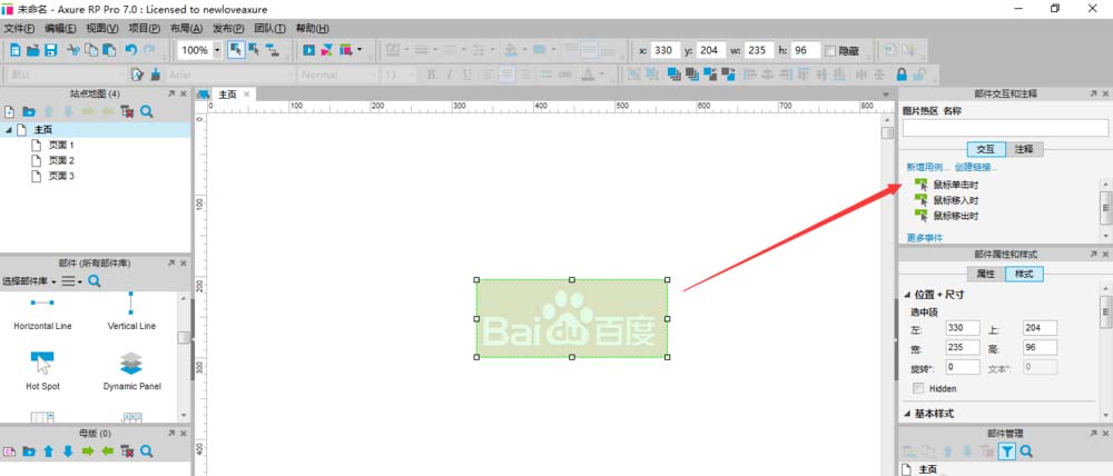 4、同样选中拖入的Hotspot,双击右上方交互功能模块下的‘鼠标单击时’按钮。
