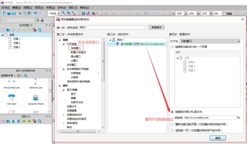 5、弹出用例编辑器,在用例编辑器中可以设定鼠标点击时,触发什么样的效果,这里我们选择在当前窗口打开一个地址链接。如图所示