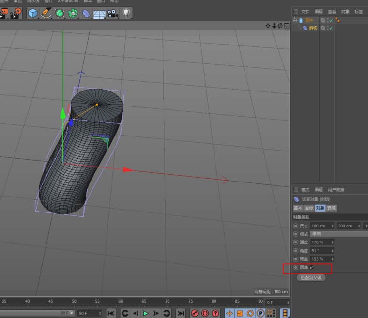 6、改变斜切属性-圆角;若加上时间轴,可以看到物体在摆动;可以多多运用,比如小草等;