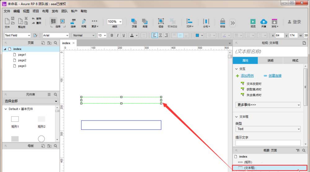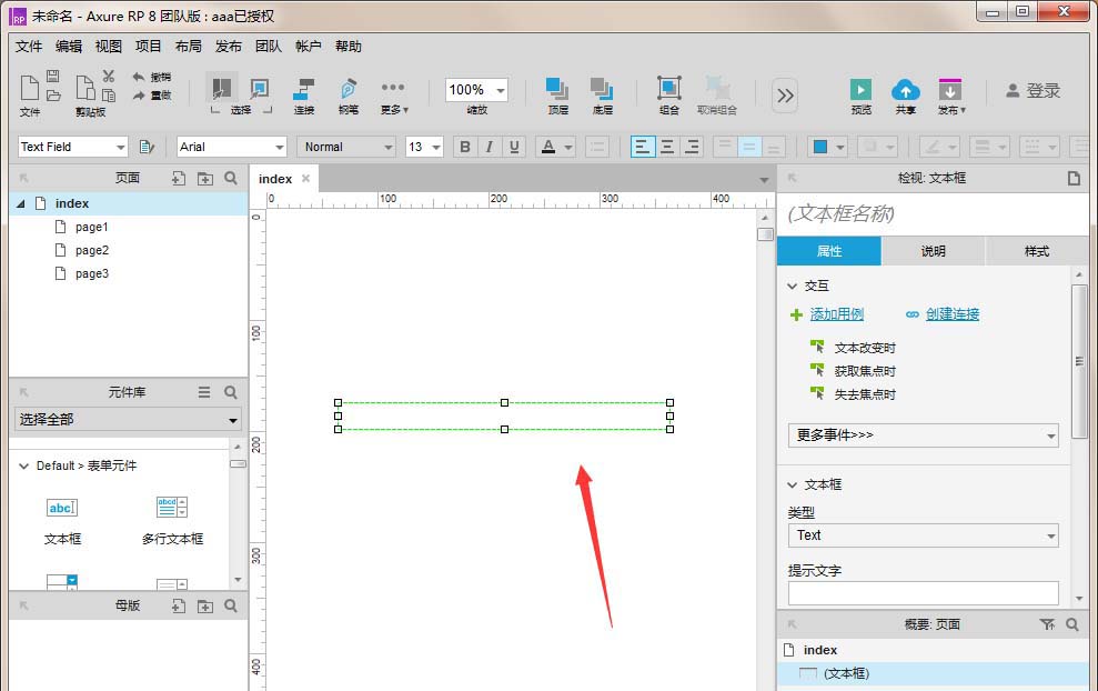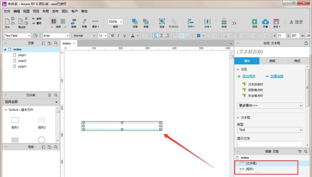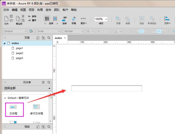 1、打开axure软件,在窗口左侧元件库中向面板拖入一个文本框。