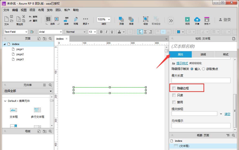 2、选中拖入的文本框,到窗口右侧 “属性" 将 "隐藏边框" 选项勾选。